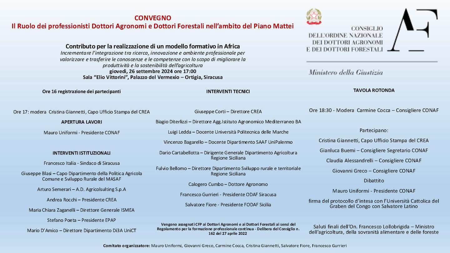 In occasione del g7 di Siracusa il conaf - consiglio ordine nazionale dottori agronomi e dottori forestali e la federazione ordini dottori agronomi e dottori forestali della Sicilia, in collaborazione con l’ordine dei dottori agronomi e forestali di Siracusa organizzano giorno 26 p.V. Ore 17.00 un convegno dal titolo “il ruolo dei professionisti dottori agronomi e dottori forestali nell’ambito del piano Mattei”.